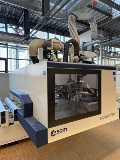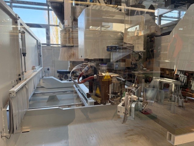 Arbeitsfeld X-Y: 3.110 x 1.620 mm, Werkstückhöhe Z180 mm HAUPTVORTEILE Struktur des Grundkörpers: Der Sockel bildet eine große und solide Auflage für den beweglichen Ständer: die Arbeitseinheit ist somit mit einer ausgeglichenen, stabilen und widerstandsfähigen Stütze ausgestattet die der stärkster Beanspruchung widersteht und somit für eine qualitativ gehobenere Leistung und größere Genauigkeit sorgt. Das bewegliche Portal besteht aus einem soliden Einzelteil das am Sockel verankert wird und das auf prysmatischen Führungen mit Gleitschuhen mit Kugelrücklauf der allerbesten Qualität entlanggleitet. Die Arbeitseinheit ist daran befestigt und bewegt sich entlang Y und Z auf prysmatischen Führungen mit Gleitschuhen mit Kugelrücklauf. Das Bewegen der unteren beweglichen Einheit (X-Achse) und der arbeitenden Einheit entlang der Stange der beweglichen Einheit (Y-Achse), erfolgt dank der Übertragung durch Zahnstange/Ritzel mit helikalen Zähnen; dadurch entsteht ein größerer Zahn-um-Zahn Schub der eine größere Beschleunigung erzielt, sowie eine größere Geschwindigkeit entlang der Achsen X und Y. Die eigens entworfene helikale Verzahnung sorgt für eine geringere Abnutzung der mechanischen Bestandteile und für einen geräuschärmeren Betrieb. Das Verschieben entlang der Achsen X-Y-Z erfolgt mit 'brushless' Motoren die von statischen Invertern angetrieben werden; diese sorgen für: Die Verwaltung der Achsenverschiebung und allgemein der Arbeitselemente der Maschine erfolgt über ein industriellen NS Modul mit digitaler Datenübertragung und 'CAN OPEN BUS' Technologie die nicht nur die schnellste Kommunikationsgeschwindigkeit erreicht, sondern auch durch elektromagnetische Interferenzen nicht von außen gestört wird. Diese Faktoren beeinflussen die Leistung des Arbeitszentrums indem die Verarbeitungszeiten mindestens um 20% reduziert werden und ermöglichen die Ausführung von komplexen Tätigkeiten mit der allergrößten Genauigkeit. Standardausrüstung Das 'PRO SPACE' Sicherheitssystem: Schutz mit BUMPERS (konform mit CE 2006/42), wodurch die Arbeitseinheiten mit einem Schutzkäfig aus gelöteten Metallplatten umzäunt sind. Versenkbare Schutzbänder dieses System ist bei empfindlichen Materialien zu empehlen, um den Aufschlag zwischen Werkstück und Bändern zu reduzieren. Verkabeltes, bewegliches Bedienfeld: praktisches Zubehörteil wodurch der Bediener alle wichtigsten Befehle der Maschine sofort zur Hand hat ohne stets auf die Hauptkonsole zurückgreifen zu müssen. Durch diese Fernkontrolle ist es möglich sich der Maschine zu nähern und die X-Y-Z Achsen halbautomatisch zu bewegen, Bohrspindeln zu selektieren/deselektieren, die Geschwindigkeit zu regeln usw. Vor allem ist das bewegliche Bedienfeld für die Kontrolle der Verarbeitungen dienlich wenn diese ausgeführt oder nur simuliert werden um die Programmierung zu kontrollieren bevor mit der automatischen Produktion gestartet wird. Zentrales und optimiertes Ansaugsystem: die einzelnen Saugleitungen, eine für jede einzelne Einheit die in der Maschine installiert ist, werden zu einem einzigen Ausgang geleitet; dadurch ist es möglich nur eine einzige Leitung der Sauganlage zu haben die mit der Maschine verbunden ist. Im Inneren der Fördertechnik sind pneumatische Ventile angebracht die von der NS gesteuert werden und die nur dann aktiviert werden um die entsprechende Leitung zu öffnen, wenn das entsprechende Aggregat in Betrieb ist; dadurch wird der Saugfluss einzig und allein an der Einheit verwendet die gerade in Betrieb ist. Dies führt zu einem besseren Reinigungsergebnis des Werkstücks und zu einem reduzierten Verbrauch und einer geringeren Lärmbelästigung. Luftdruck Multiplikator (nur für den Bohrkopf) vermittelt den Ro.Ax. Spindeln einen größeren Schub während der Betriebsphase; da jede Spindel mehr als 64 kgf wiegt, kann jede Spindel die maximale Leistung beim Eindringen erzielen, auch bei besonders widerstandsfähigen Stoffen. Automatischer Schmierkreis, eine Schmierpumpe die von der NS gesteuert wird sorgt dafür, dass die mechanischen Bestandteile entlang der Bewegungsachsen zu gegebenen Zeitabständen richtig geschmiert werden (Hilfsgleitschuhe, Zahnradketten, Ritzel, Schrauben mit Kugelrücklauf usw.). Dieses System garantiert die automatische Ausführung einiger standardmäßigen Wartungseingriffe. Geht das Fett in der Pumpe zu Ende, wird an der Steuerkonsole der Maschine eine Alarmmeldung angezeigt um den Bediener darauf hinzuweisen, dass neues Fett aufgefüllt werden muss. Vakuumanlage, alle Bestandteile der Vakuumanlage wurden derart bemessen dass immer die maximale Leistung und der von der Pumpe größte Vakuumwert erbracht werden. Die Maschine kann mit Vakuumpumpen ausgestattet werden die ein sicheres Arretieren auch kleiner Stücke mit unterschiedlich geometrischer Form garantieren. PC OFFICE und eine bewegliche Konsole Ausstattung für Fernservice: - die HMI Bedienerschnittstelle visualisiert wird PC Netzverbindung, eigens vorgesehener Anschluss um PC Office über Kabel an das Firmennetz zu verbinden um die Datenübertragung in Echtzeit von/zu der Maschine zu ermöglichen. Software 'MAESTRO EDGE' – Bedienerschnittstelle und Programmierung Die Bedienerschnittstelle weist eine einfache, sofort verständliche Grafik auf und verwendet die modernsten Darstellungssymbole für Objekte um sich mit folgendem Layout zu zeigen: Der CAD Teil der Anwendung bietet durch eine Sketching Umgebung, vielseitige Funktionen zum Zeichnen und verfügt über folgende, elementare Geometrien: An den geometrischen Figuren können weitere Vorgänge ausgeführt werden, wie z.B das Zeichnen von Verbindungsteilen, abgekantete Teile und Verbindungen von Geometrien. Die parametrische Programmierung ist eingeschlossen: die Parameter können dem Hauptprojekt wie den einzelnen Unterprogrammen zugewiesen werden oder auch den Makros die vom selbigen abgerufen werden. Jedes Werkzeug wird mit einem Namen gekennzeichnet u
